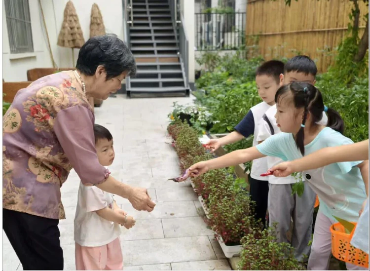 小朋友还和居民、特需人士一起采摘,主动把刚采摘的、还带着泥土气息的小辣椒递到一位小妹妹手中,小脸认真说:“妹妹,送给你!”,孩们在生活中学会分享,学会互助。