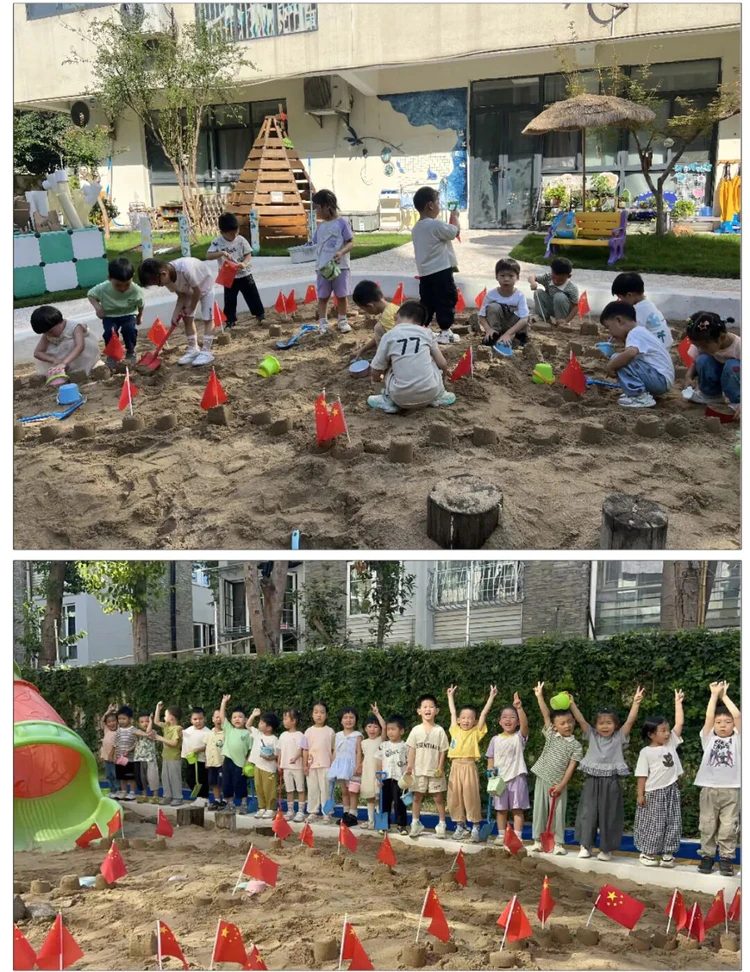 户外沙池区,“小小建筑师” 们的创作同样热烈。孩子们手持铲子、水桶分工协作:有的奋力铲沙,堆叠出 “长城城墙” 的雏形;有的仔细插上迷你五星红旗,让“长城”在沙地上与红旗相映成趣。阳光洒在沙池里,一座座沙制 “烽火台”“城墙” 逐渐成型,蜿蜒的 “长城” 仿佛在沙间复刻出恢弘气象。当作品完成时,孩子们举着工具欢呼,在游戏般的 “筑城” 过程中,家国情怀的种子悄然在心底萌发。