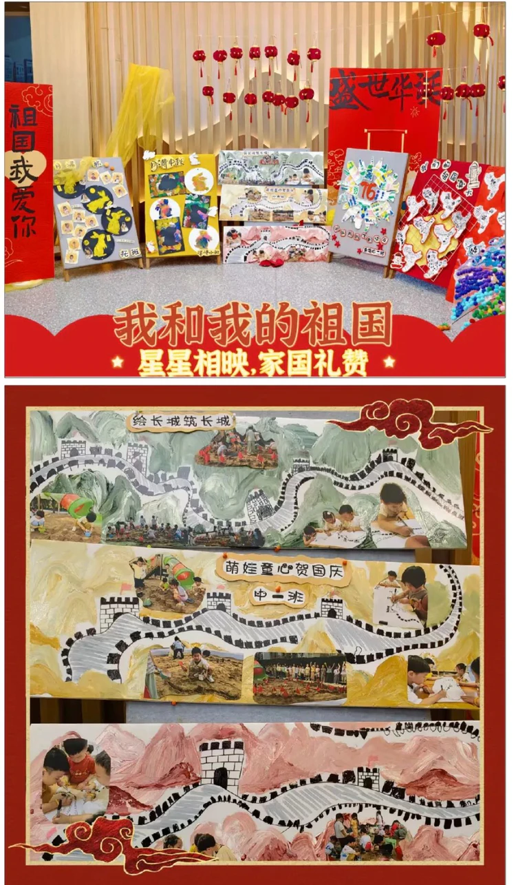 孩子们的创作成果被精心布置成展陈。“盛世华诞”“祖国我爱你”的红色展板旁,既有充满想象力的长城画作,也有沙池建构的精彩瞬间照片。师生们驻足欣赏,在童趣满满的艺术与游戏记录里,共同触摸祖国的伟大,为祖国 76 岁生日献上最纯真的祝福。