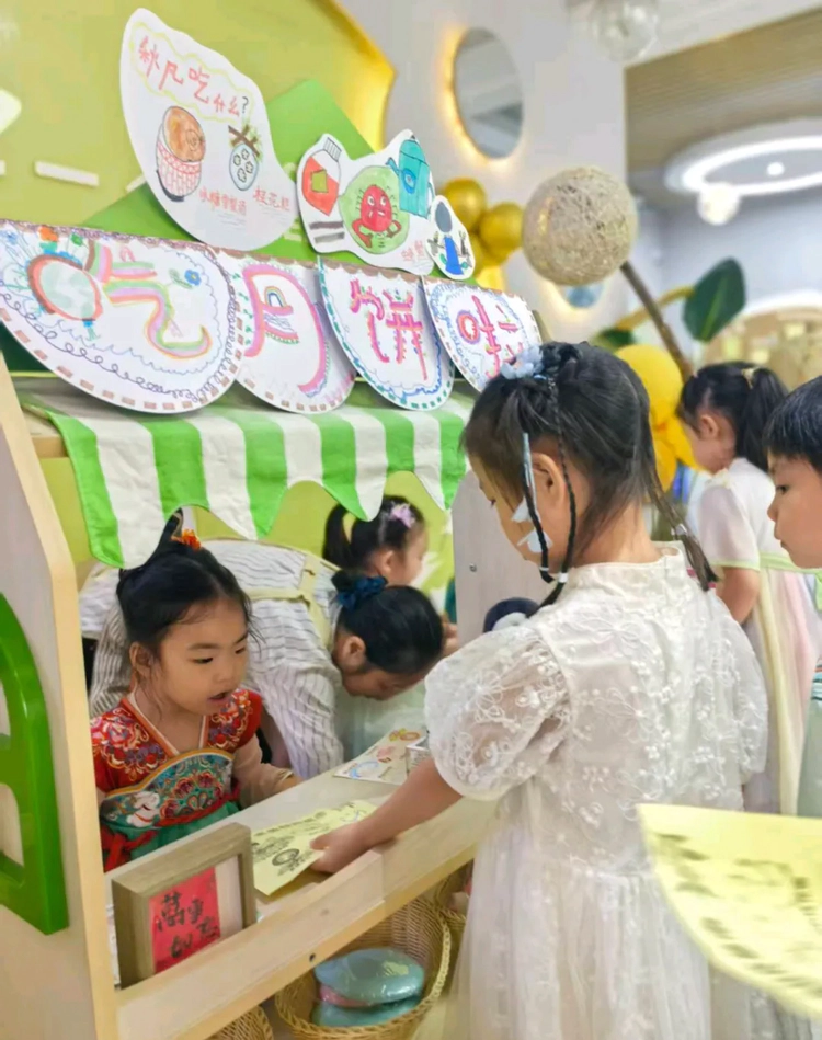 桂花小圆子摊位前,孩子们亲手制作的小圆子糯唧唧的,裹着清甜的蜜香。孩子们品尝时满足的笑脸,成了这个秋天最温暖的画面;桂花蜜摊位前,孩子们在制作独具创意的酸奶桂花蜜。酸奶的醇厚与桂花的清甜在口中完美融合,构成了一道清新不腻的中秋特饮;月饼品尝区,孩子们细细品味着。豆沙的绵密、莲蓉的清甜,每一种味道都是对中秋团圆最直接的味觉解读;棉花糖饼干制作区,从选择配料到等待成品,每个孩子都化身为小小烘焙师,创造着独一无二的中秋美味。