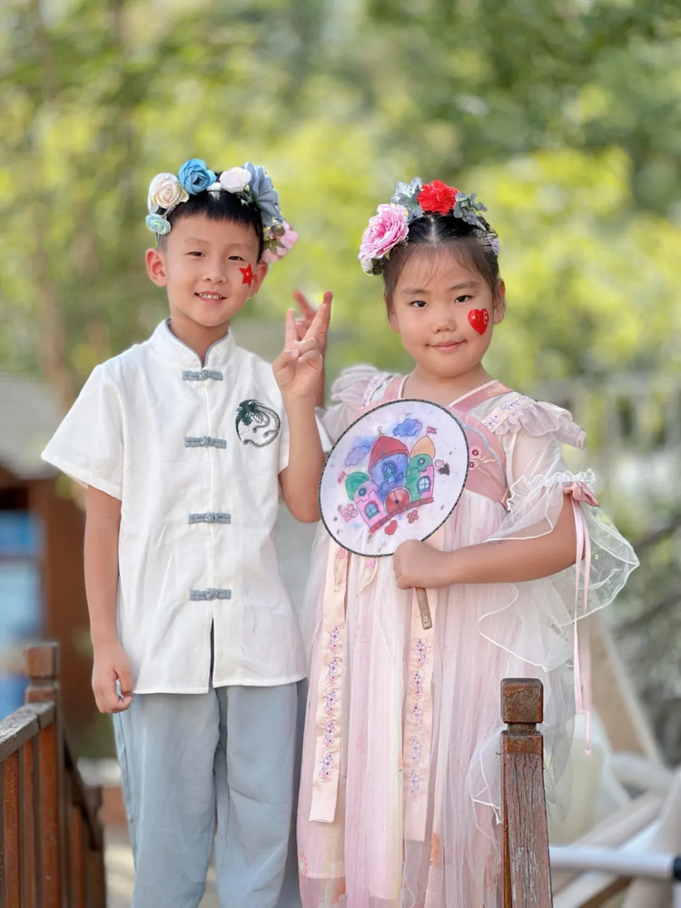 稚嫩的歌声里满是对祖国的热爱,《歌唱祖国》的旋律在校园回荡,小小的身影跟着节拍挥动国旗,眼里闪着明亮的光;幕布前,皮影戏缓缓上演,孩子们瞪着好奇的眼睛,跟着故事里的角色探索传统文化的奇妙;中秋茶话会上,甜甜的月饼、清香的茶水摆上桌,小芽儿们分享美食、轻声交谈,笑声与节日的暖意满溢角落。