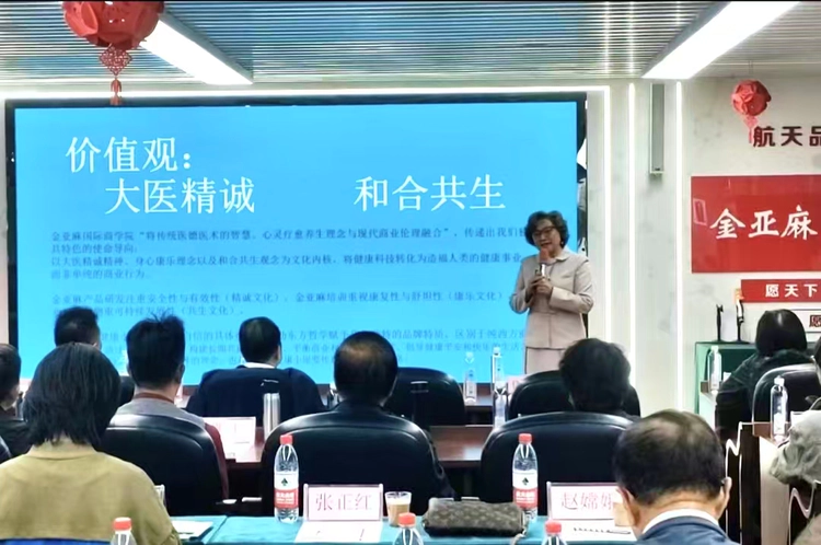 侯春瑶(药王孙思邈第49代传承人、金亚麻国际健康公司商学院院长):从专业角度解读金亚麻植物欧米伽-3营养元素对人体健康的重要作用,同时简述商学院规划——将围绕健康小屋运营需求,开发并落地专业人员培训课程,为健康小屋储备优质运营人才。